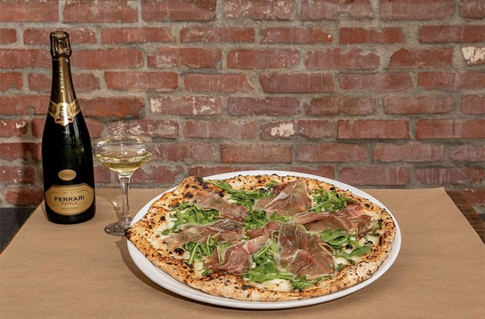 Пиццайоло Симоне Лавароне из Eataly Chicago смягчает резкий вкус острого томатного соуса Сан-Марцано, ндуйи, острой салями Феррарини, моцареллы из буйволиного молока, рукколы и лимонной цедры округлостью Ferrari Rosé NV и пузырьков Trentodoc.