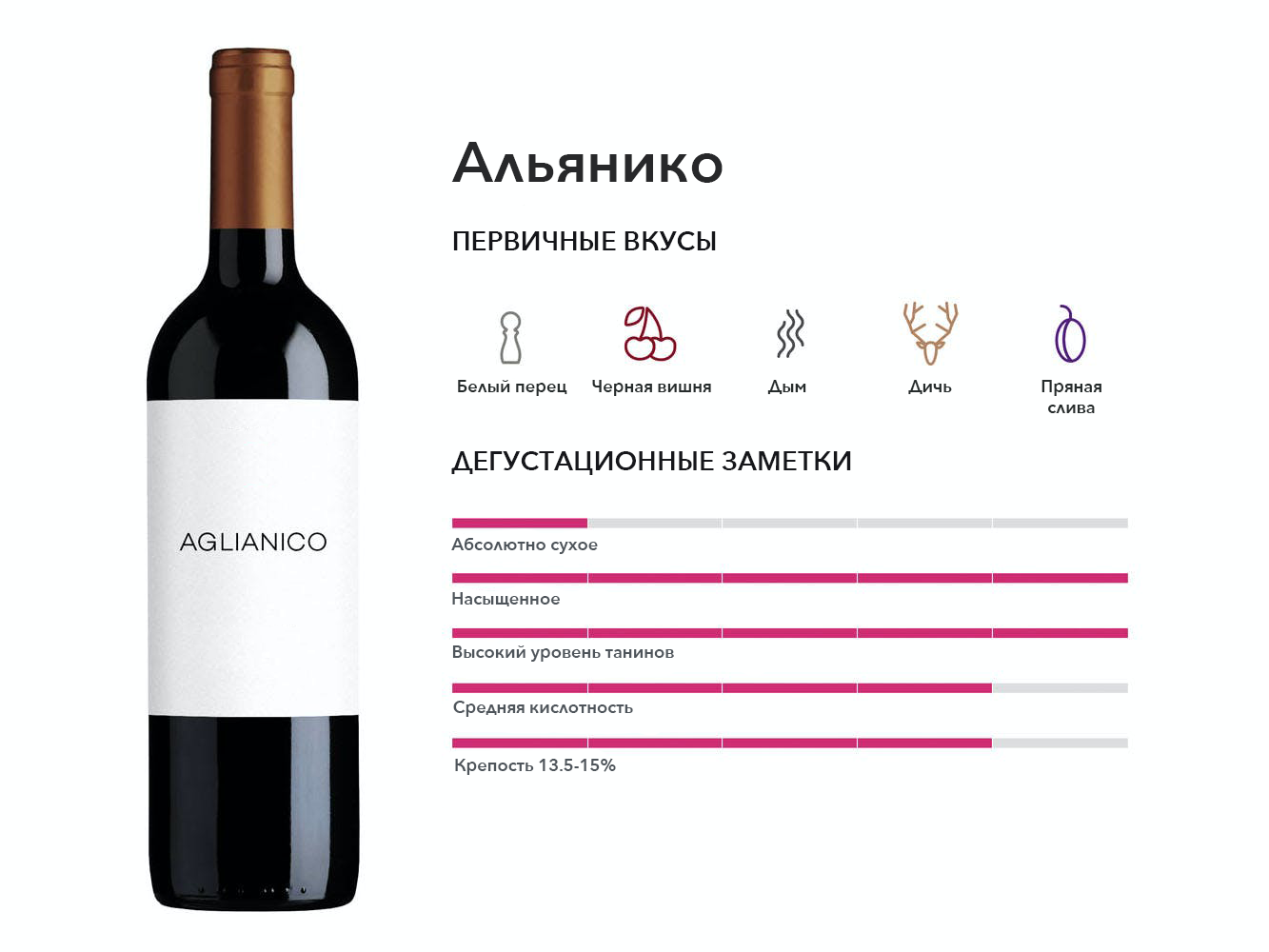 Если Неббиоло — король Северной Италии, то Альянико — король Южной. Вино невероятного качества с уникальным пикантным вкусом, которым лучше всего наслаждаться в выдержке.