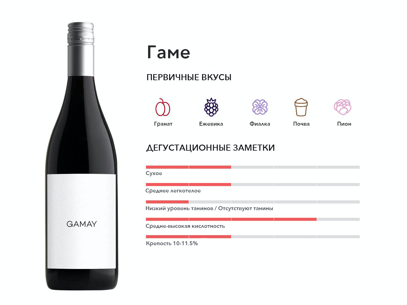 Фруктовый, цветочный, а иногда и землистый, легкий красный цвет, который является основным сортом, выращиваемым в Божоле. За пределами Франции у Гаме есть крошечная, но преданная аудитория.
