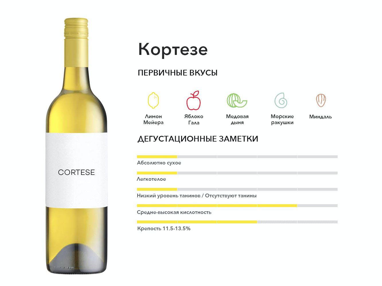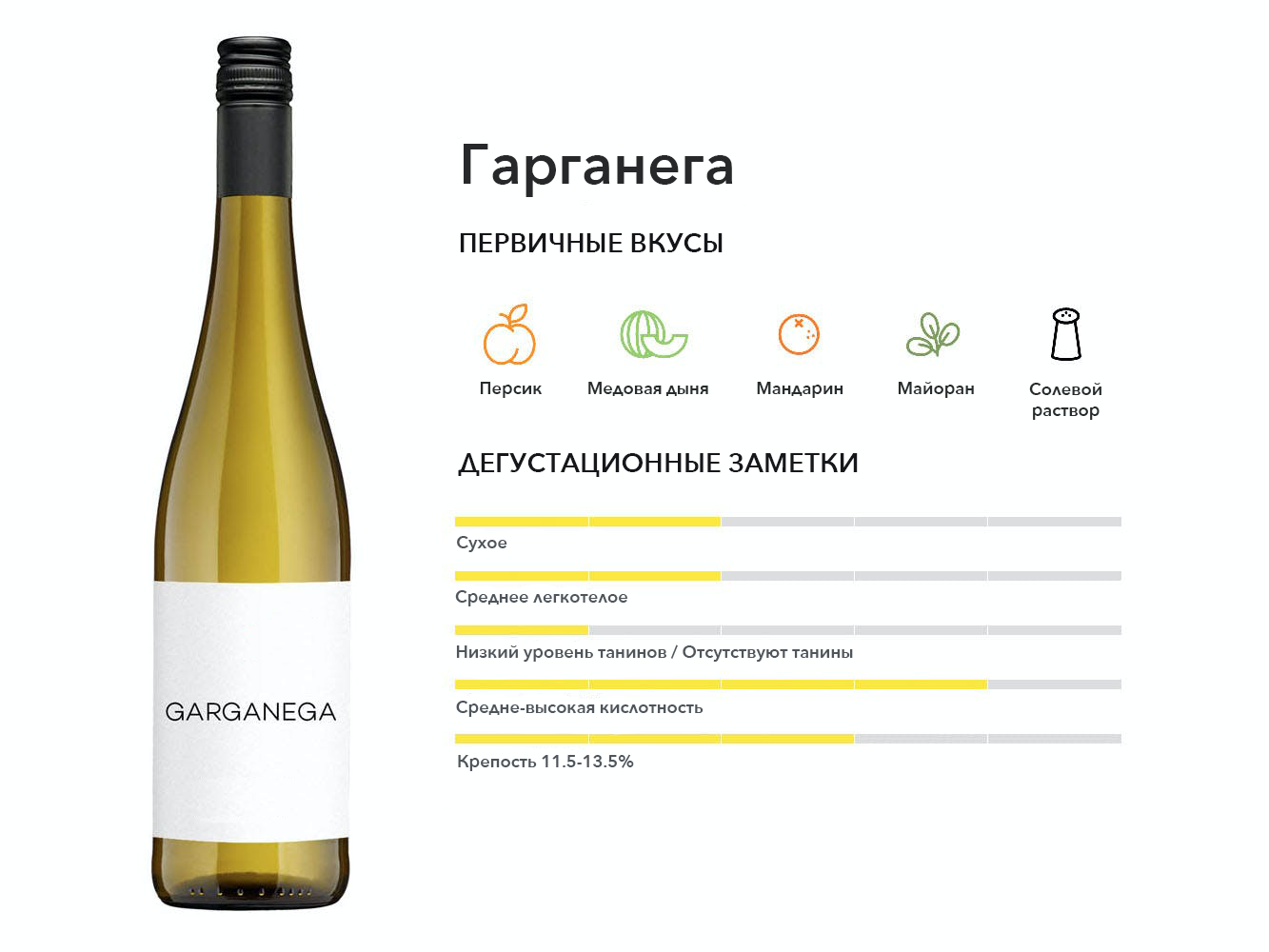 Важное итальянское белое вино, любимое за его постный, сухой стиль, который с возрастом приобретает богатые ноты мандарина и жареного миндаля. Гарганега - основной сорт винограда Соаве.