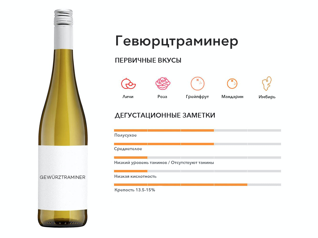 Гевюрцтраминер ценится за свои интенсивные цветочные ароматы и веками процветал в Германии. Качественные образцы достойны старения, но большинство из них лучше всего употреблять в молодости, чтобы сохранить кислотность.