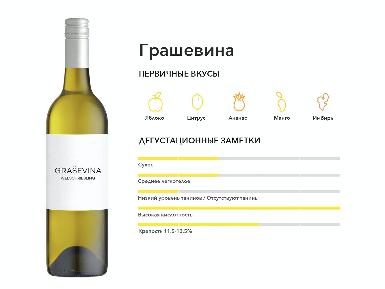 Грашевина, также известная как Вельшрислинг, является наиболее широко выращиваемым белым сортом винограда в Хорватии, но по непонятной причине не имеет никакого отношения к немецкому Рислингу. Вина обычно нейтральны и легко пьются.