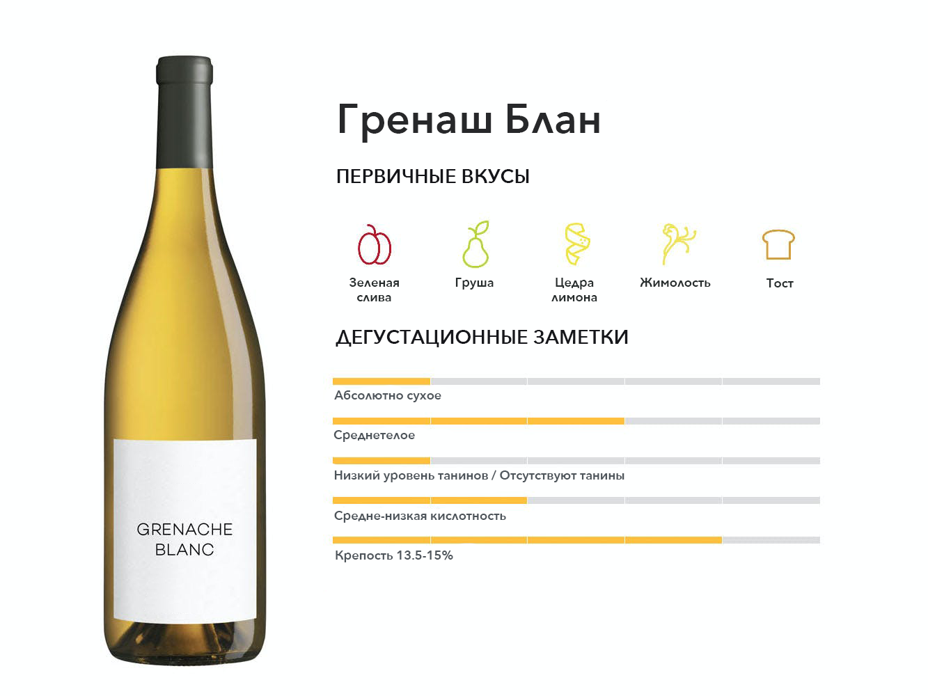 Гренаш Блан — это цветовая мутация сорта Гренаш, из которого получают полнотелые белые вина, которые иногда выдерживают в дубовых бочках, чтобы придать им поджаренный, сливочный, укропный вкус.