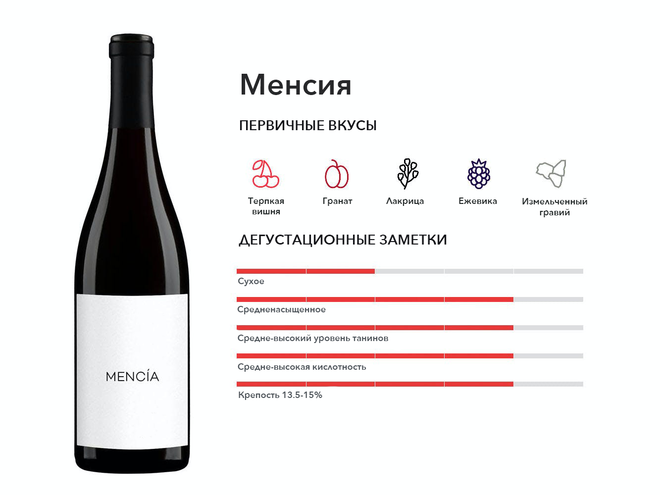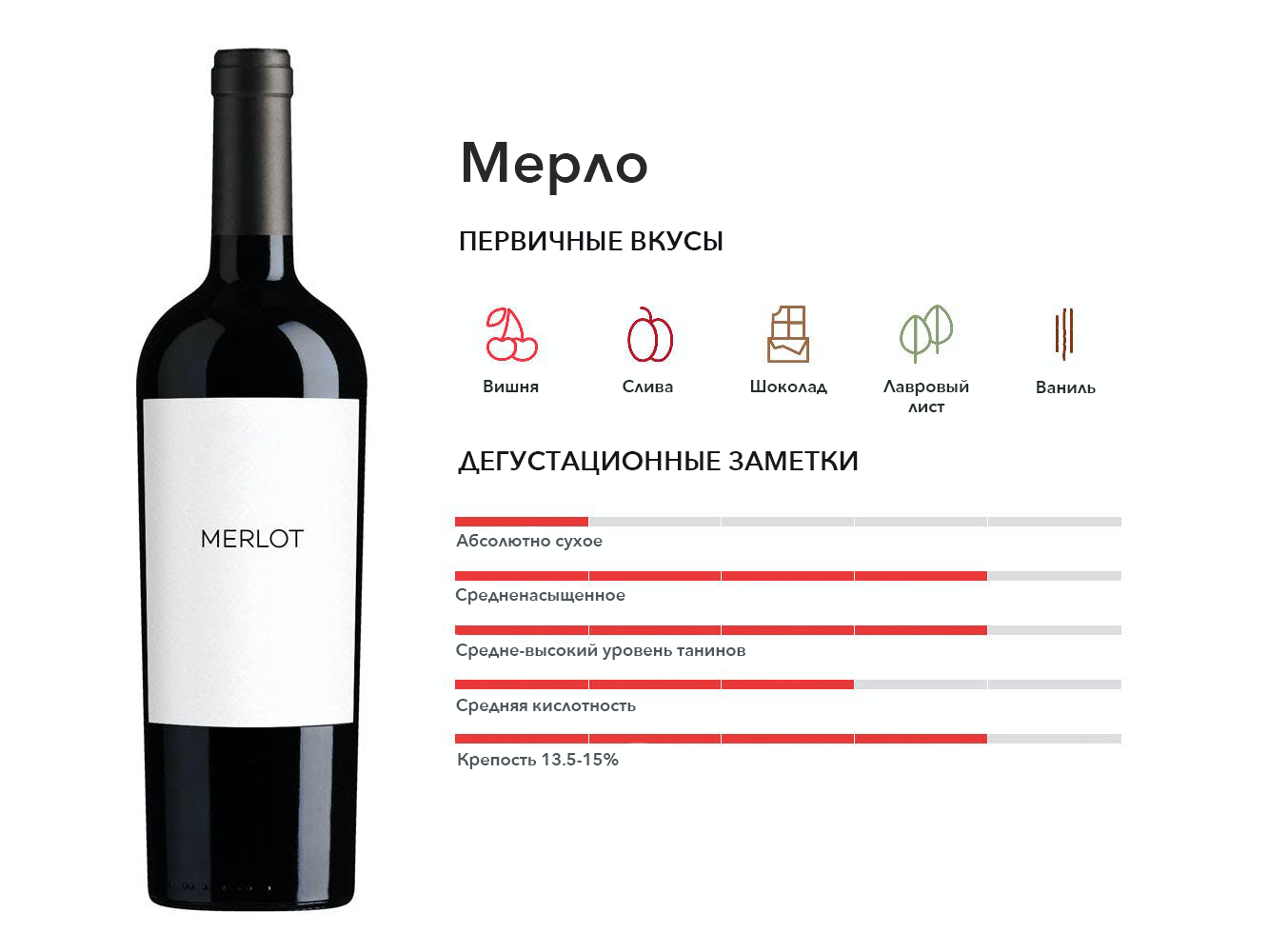 Мерло любят за насыщенный вкус черной вишни, мягкие танины и шоколадное послевкусие. На верхнем уровне его часто путают с Каберне Совиньон и обычно смешивают с ним.