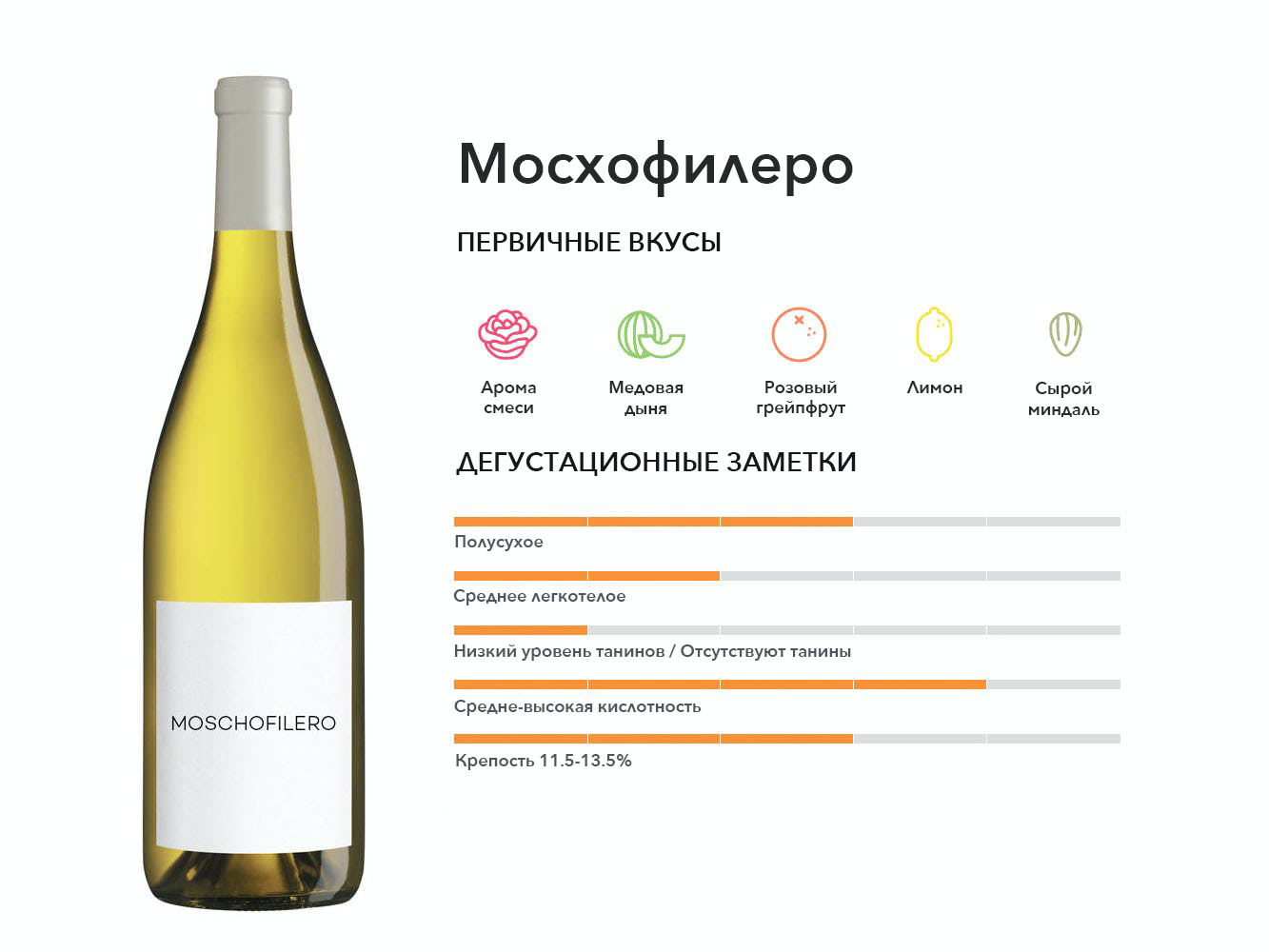 Древний ароматный белый сорт родом из Греции, доступный во многих стилях: от сухого до сладкого, до негазированного, игристого и крепленого.