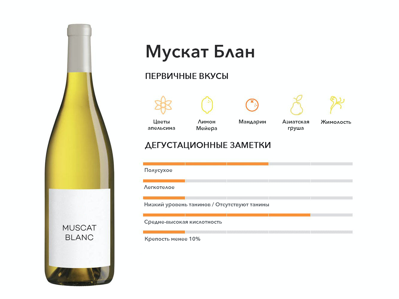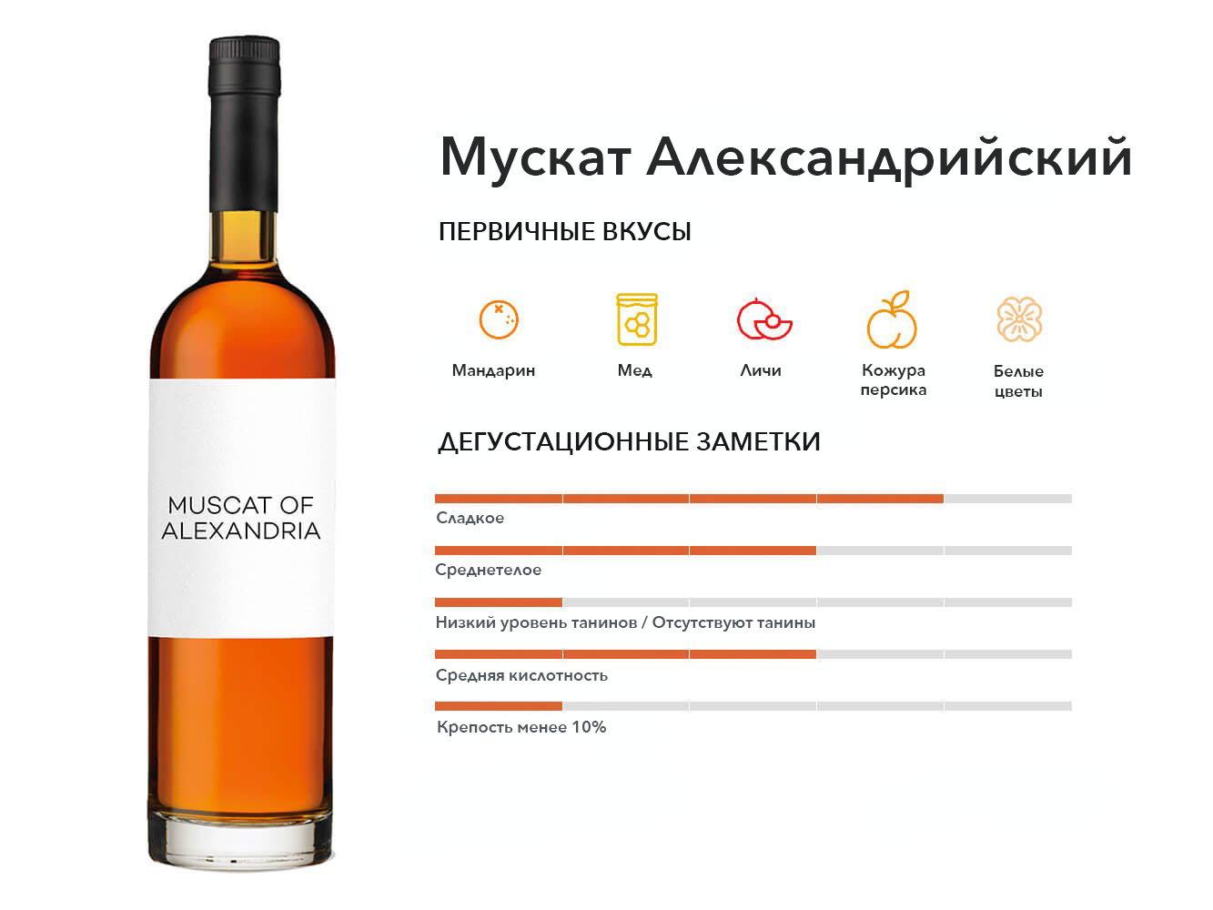 Еще один важный сорт муската, используемый в основном для десертных вин, который дает немного больше мандарина, апельсиновой цедры и нот сладкой розы, чем Мускат Блан.