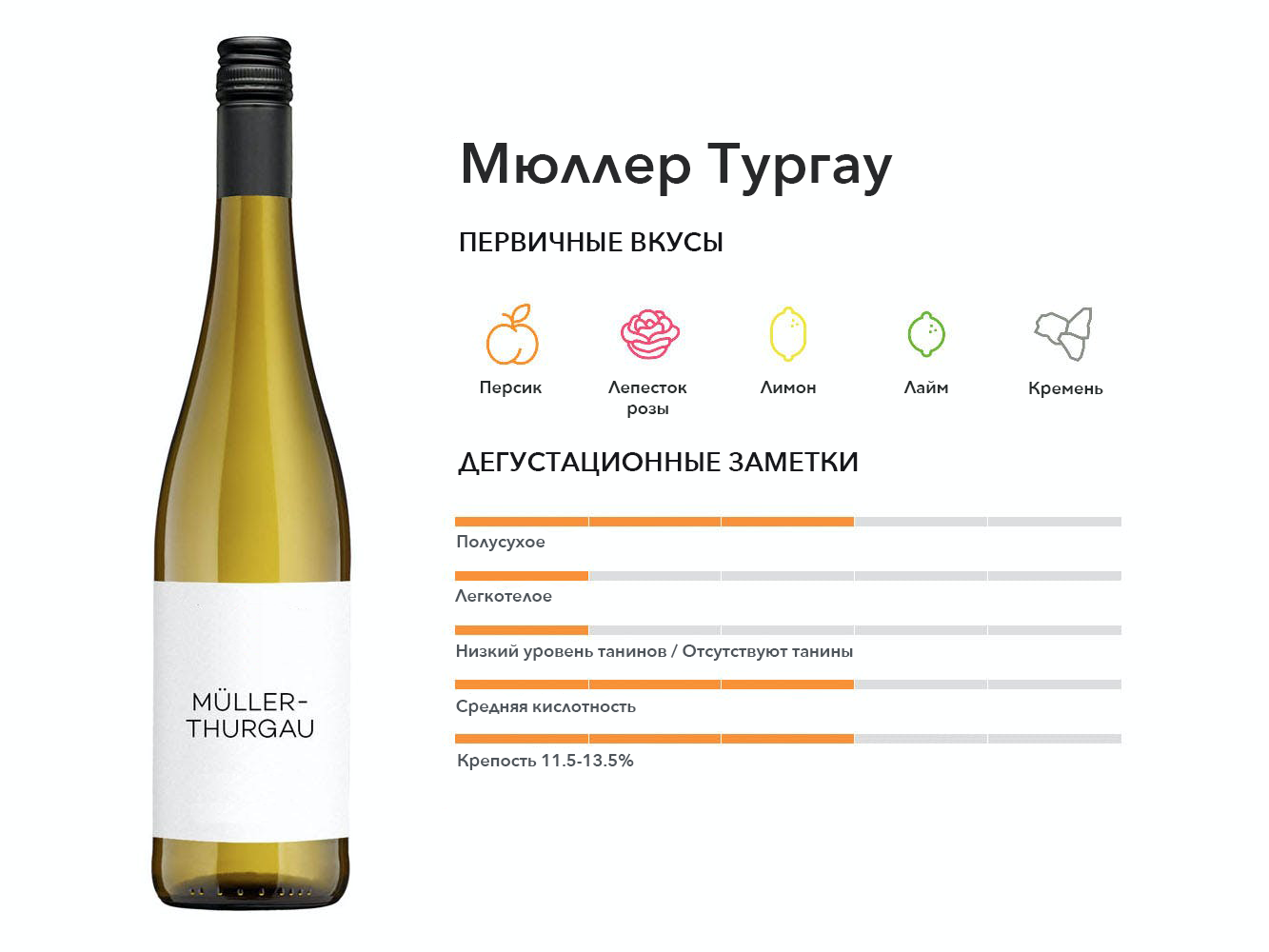 Помесь Рислинга и Мадлен Рояль, лозы, как известно, гиперпродуктивной, и поэтому большинство вин несколько скучны. Тем не менее, винодельни, ориентированные на качество, предлагают Мюллер-Тургау с той же сложностью, что и изысканный Рислинг.