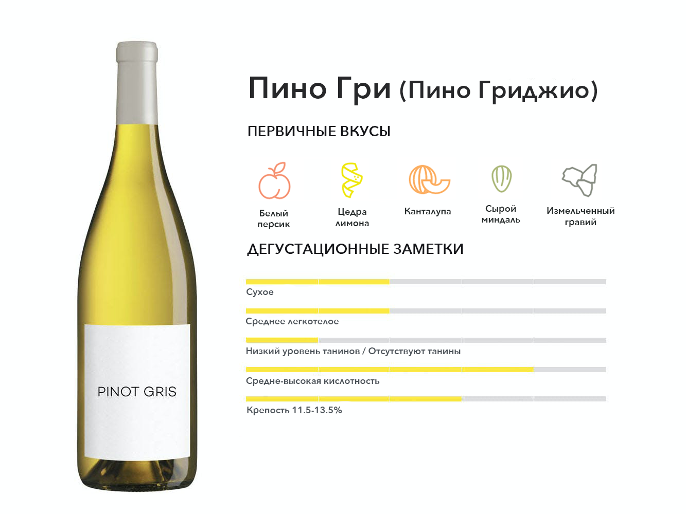 Пино Гри (он же Пино Гриджио) — розоватая мутация винограда Пино Нуар. Он известен своими пикантными белыми винами, но его также можно использовать для розовых вин. Посмотрите на Северную Италию, Орегон и Эльзас, чтобы найти эталонные примеры.