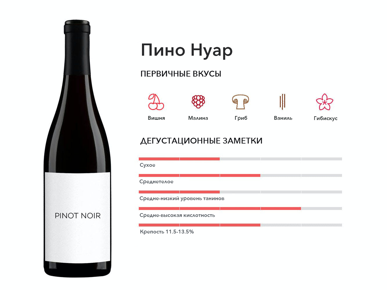 Пино Нуар — самое популярное легкотелое красное вино в мире. Его любят за ароматы красных фруктов, цветов и специй, которые подчеркнуты долгим, гладким послевкусием.