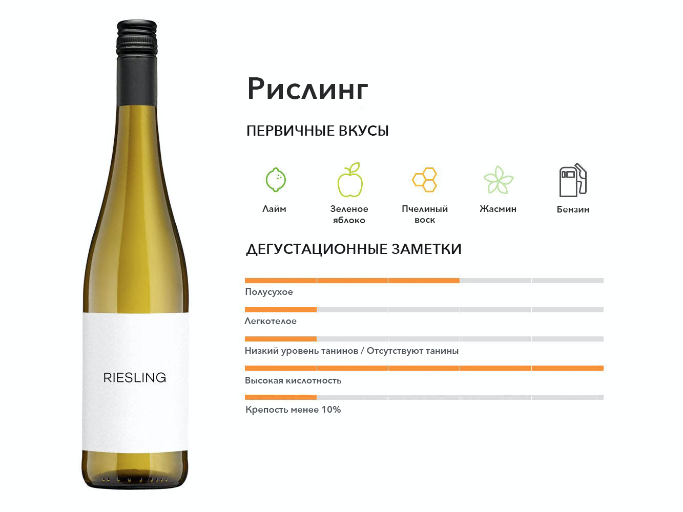 Ароматный белый сорт, из которого можно производить белые вина по стилю от сухого до очень сладкого. Германия является крупнейшим производителем Рислинга в мире.