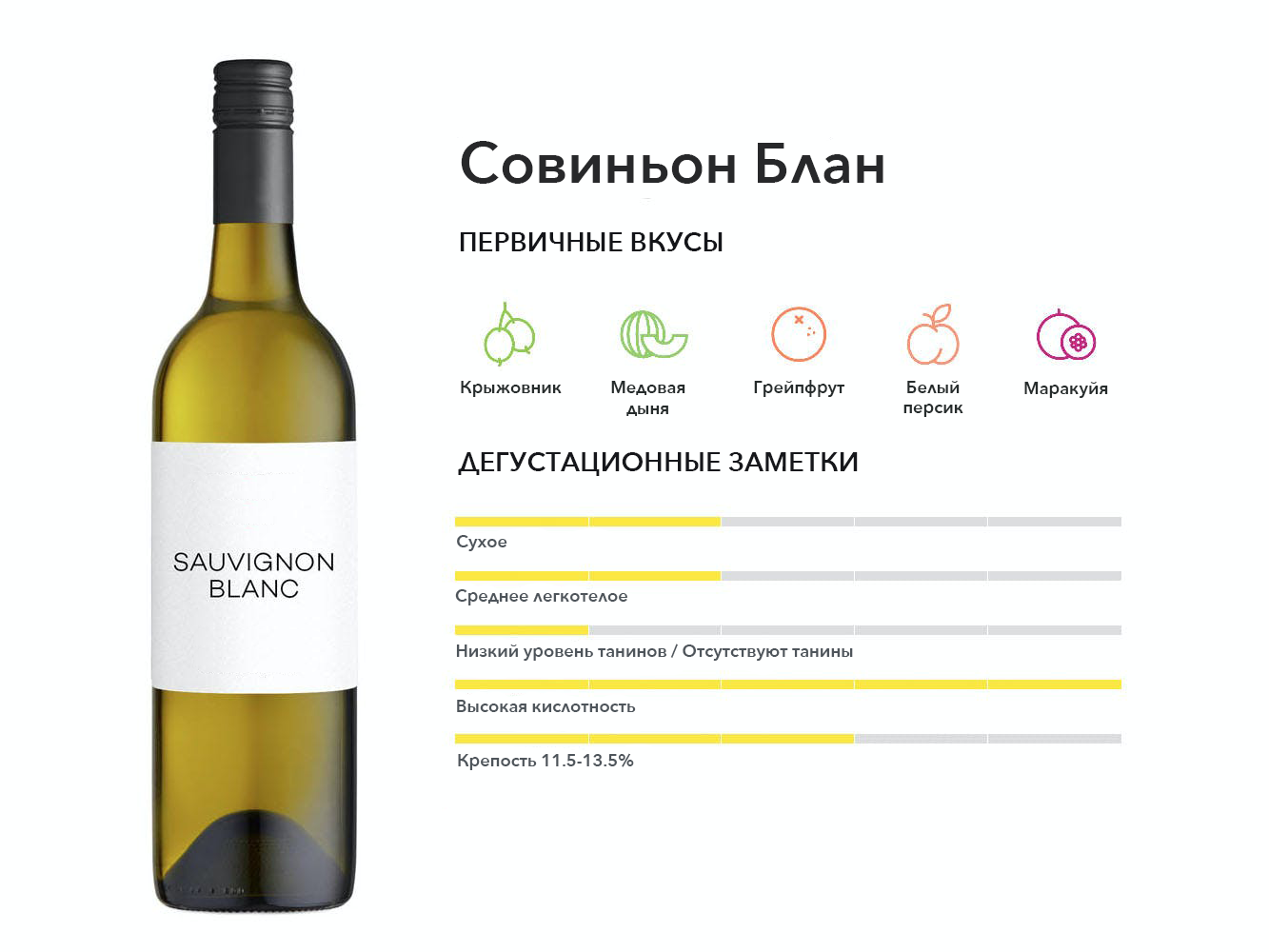 Популярное и безошибочно узнаваемое белое вино, любимое за его «зеленый» травяной вкус и пикантную кислотность. Совиньон Блан растет почти везде и, таким образом, предлагает множество стилей, от скудного до обильного.