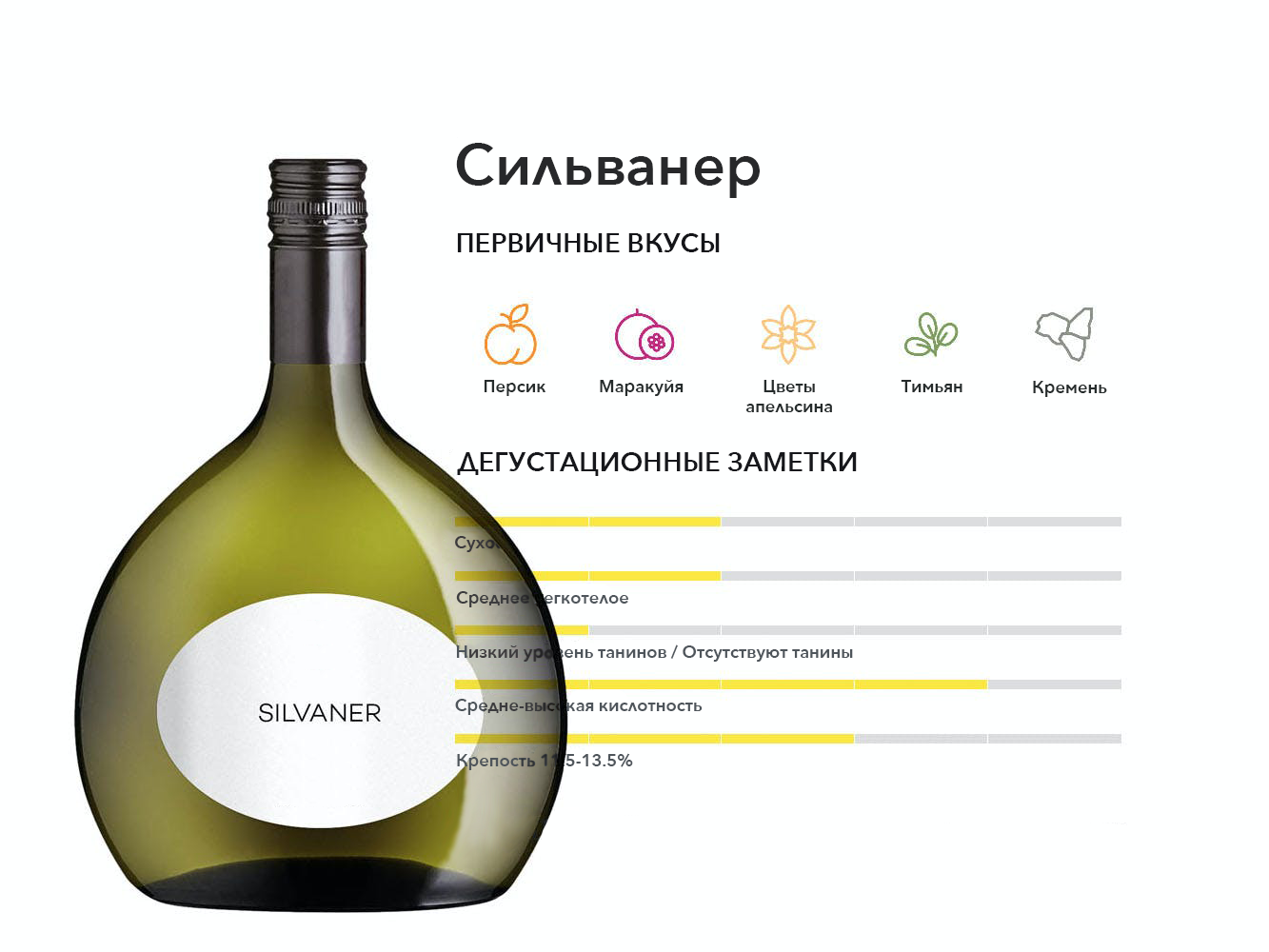 Недооцененное белое вино, в основном произрастающее в Германии. Вина Silvaner отличаются ярко выраженными персиковыми фруктами, контрастирующими с тонкими травяными ароматами. Любители Пино Гри будут в восторге.