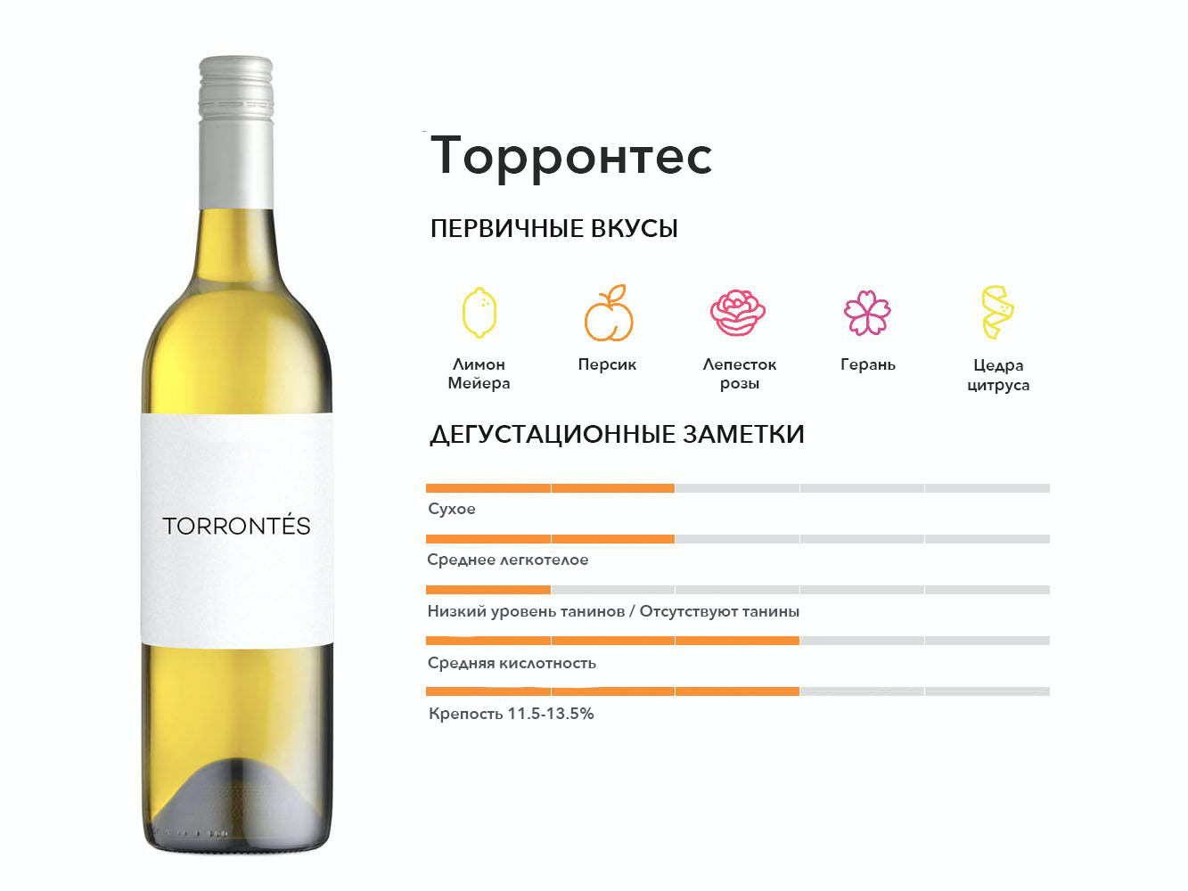 Собственный аргентинский белый на самом деле представляет собой группу из 3 сортов, которые являются потомками Муската Александрийского. Из 3-х сортов Торронтес Риохано считается лучшим.