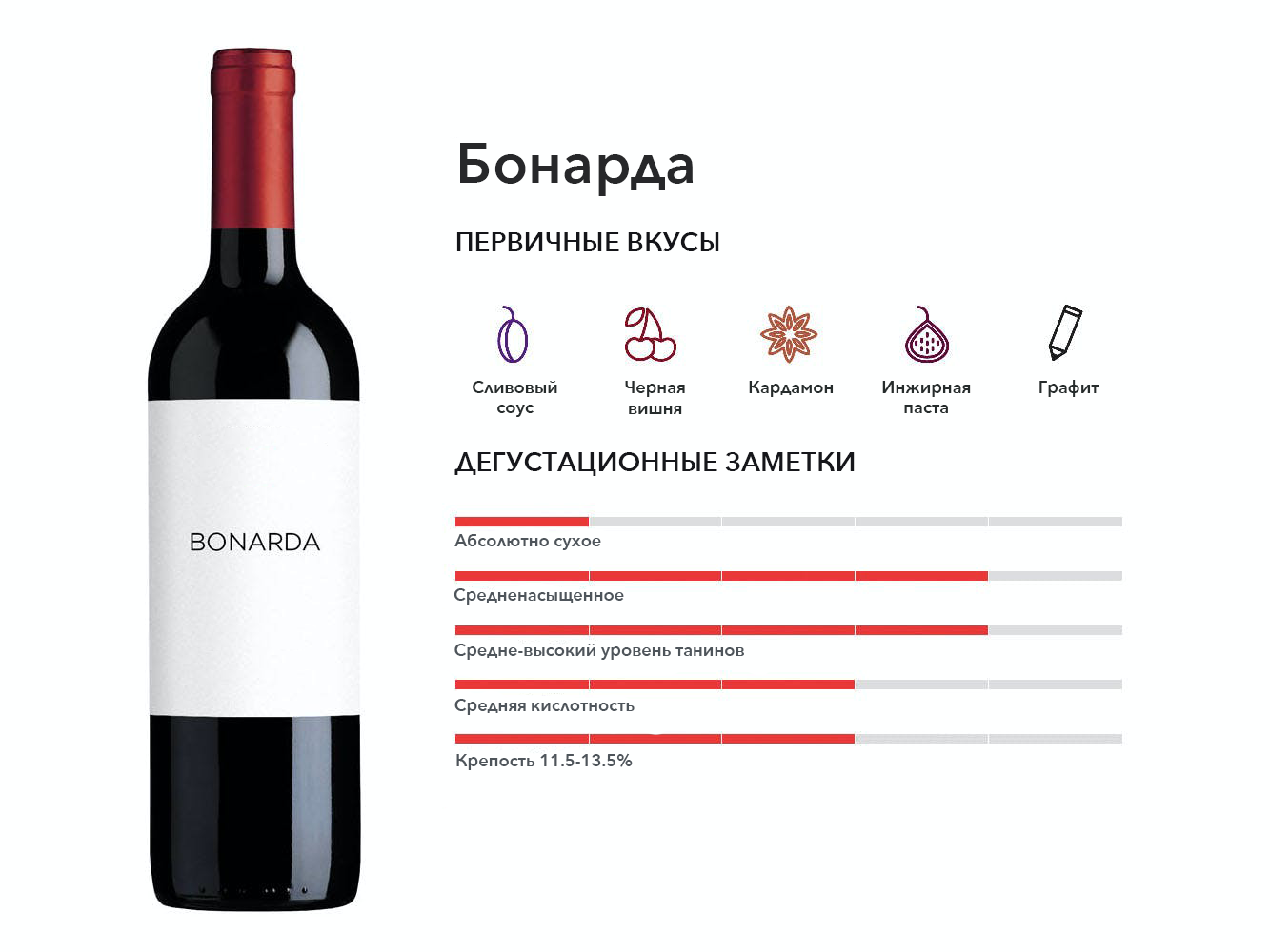 Это не тот виноград, что Бонарда из Италии, эта Бонарда (он же Шарбоно или Дус Нуар) растет вместе с Мальбеком в Аргентине, где из него получаются такие же фруктовые, гладкие красные вина.