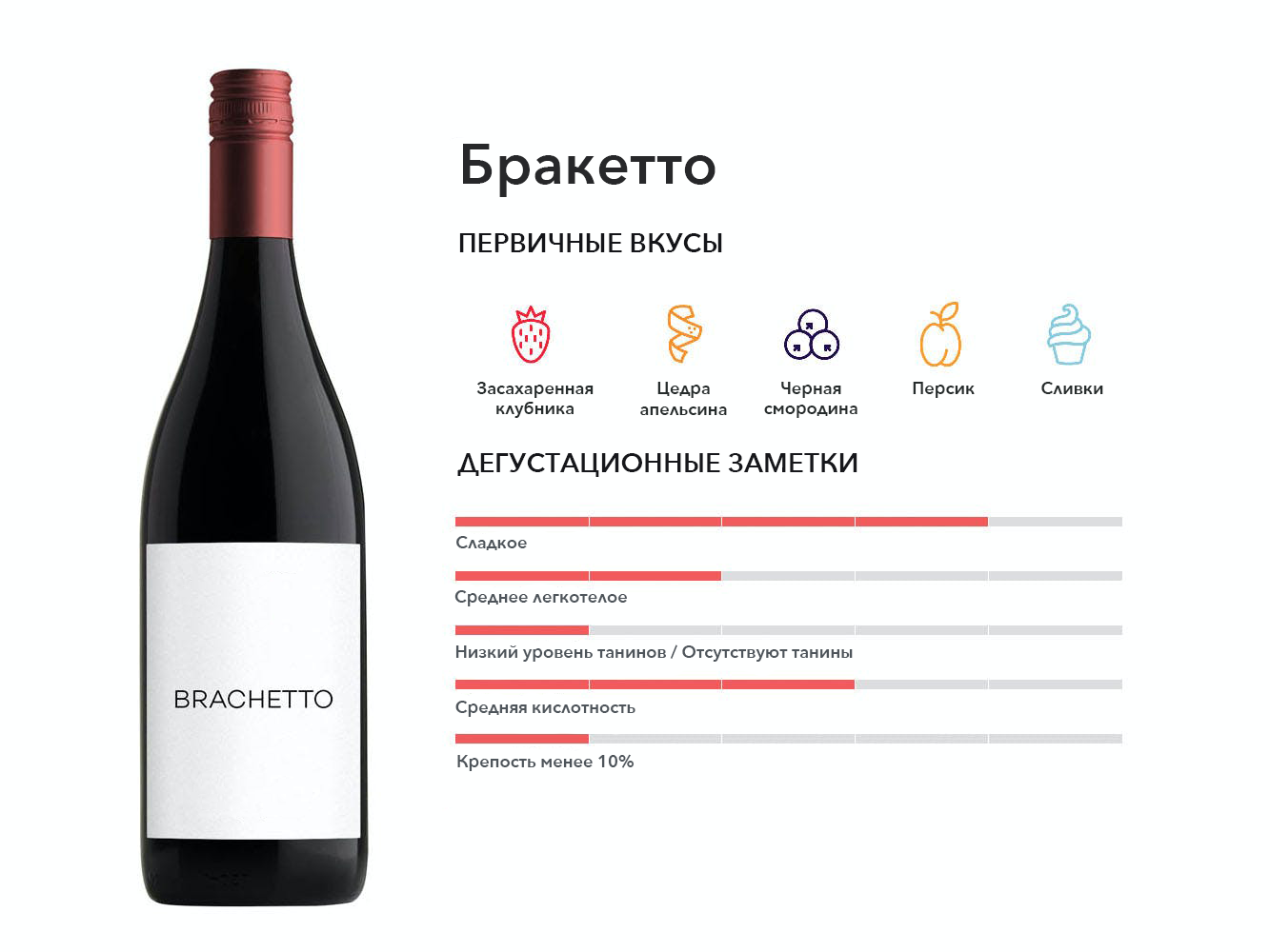 Brachetto d’Acqui — фризанте (полуигристое) сладкое красное вино из Пьемонта, известное своими засахаренными и цветочными ароматами.