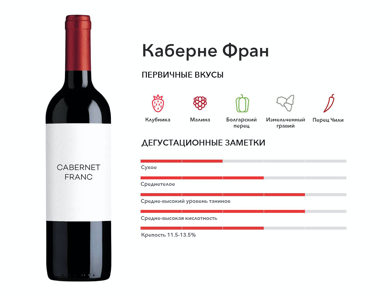 Каберне Фран является родоначальником Мерло и Каберне Совиньон. В результате получаются сложные красные оттенки с ароматами малины, ежевики и сладкого перца (пиразины).