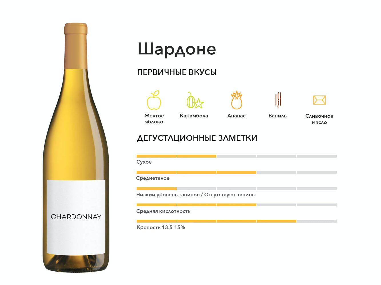 Шардоне, один из самых популярных сортов винограда в мире, производится в самых разных стилях: от нежирных игристых Блан де Блан до насыщенных кремовых белых вин, выдержанных в дубовых бочках.