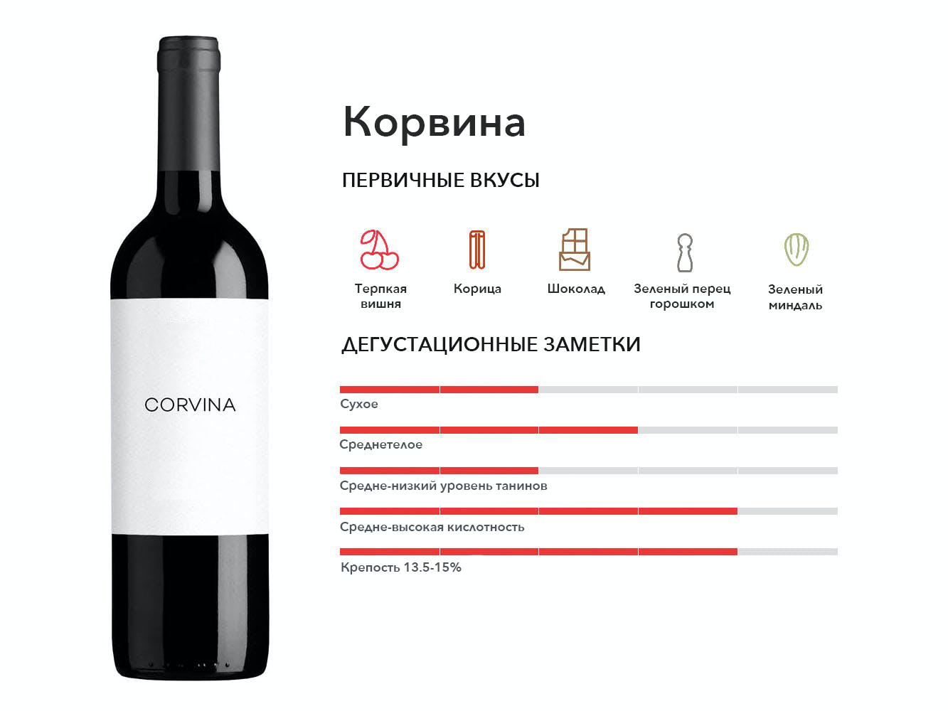 Корвина — это сорт винограда темного красного вина, который обычно выращивают и используют в Италии, а также для производства Вальполичеллы и Амароне.
