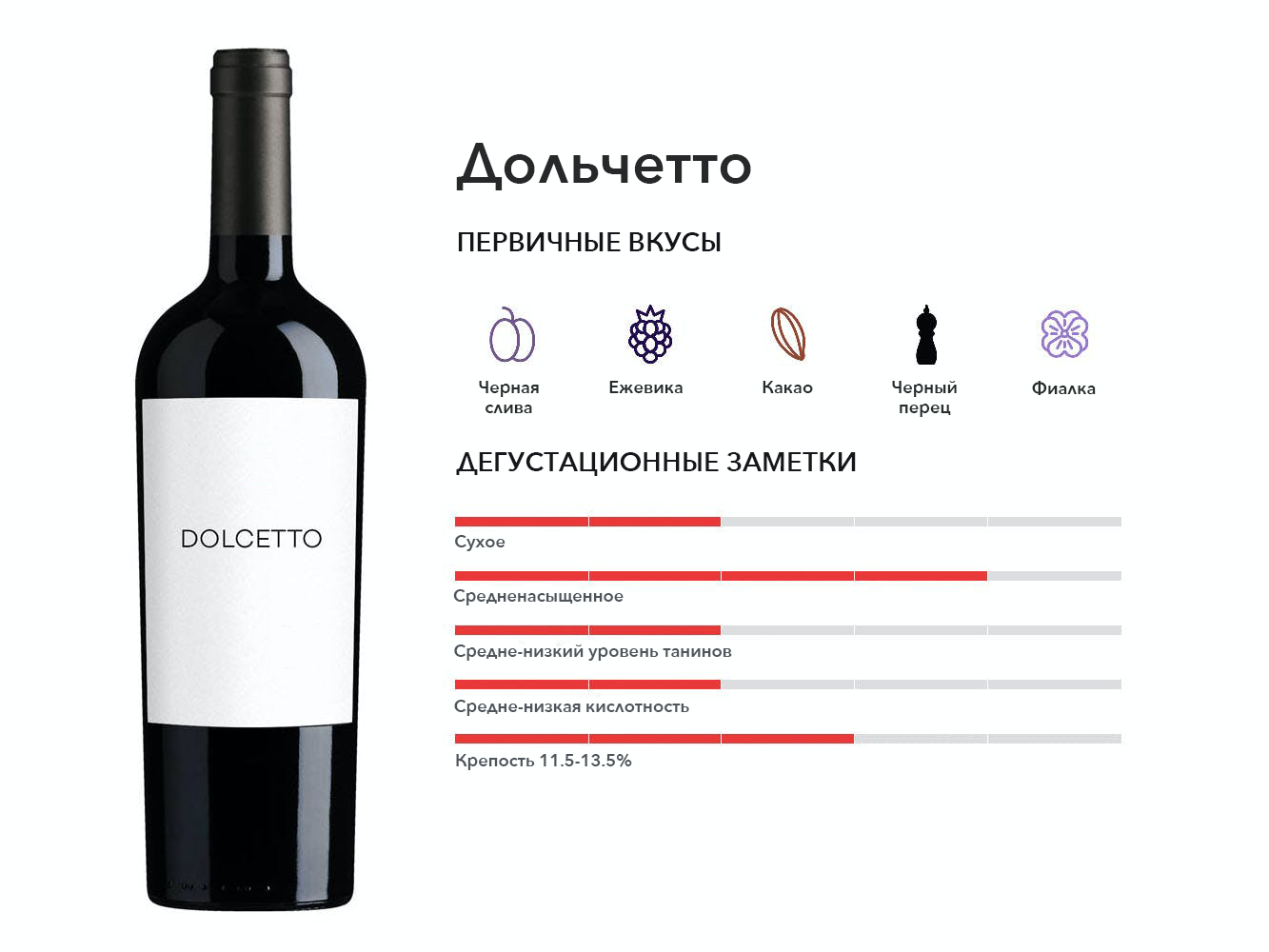 В Пьемонте, на родине Дольчетто, это имя означает «маленький сладкий». Как ни странно, вина, как правило, терпкие, с большим количеством ароматов черных фруктов и иногда с агрессивными танинами.