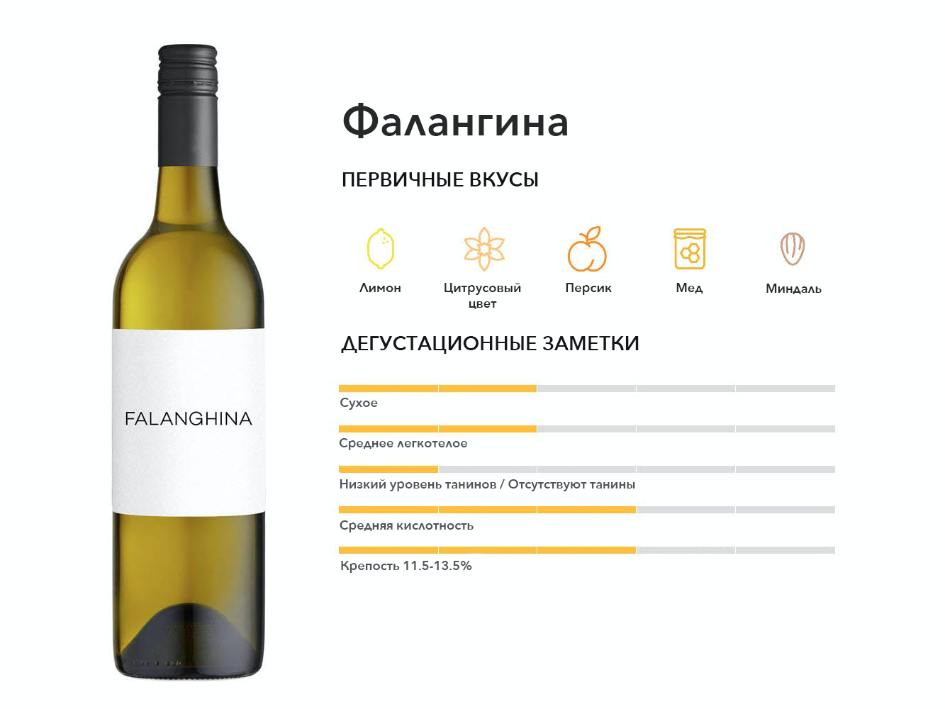 Два уникальных сорта (Falanghina Beneventana и Falanghina Flegrea) определяют фирменный белый цвет Кампании. Вина пикантные с нотками персика, минералов и миндаля.