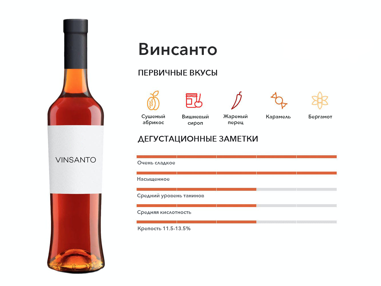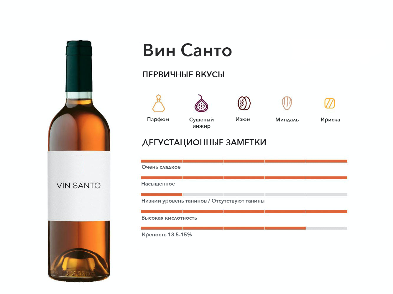 Vin Santo или «святое вино» — редкое десертное вино, произрастающее в основном в Тоскане. Виноград сначала сушат на соломенных циновках, чтобы сконцентрировать сахара, и ферментация может занять до 4 лет.