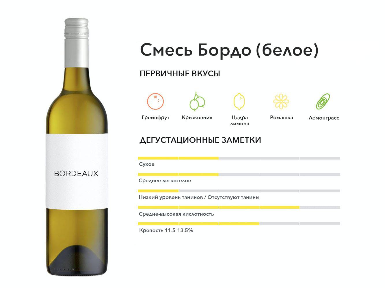 Белая смесь, в которой преобладают сорта Семильон и Совиньон Блан, а также другие сорта винограда, произрастающие в регионе Бордо во Франции.