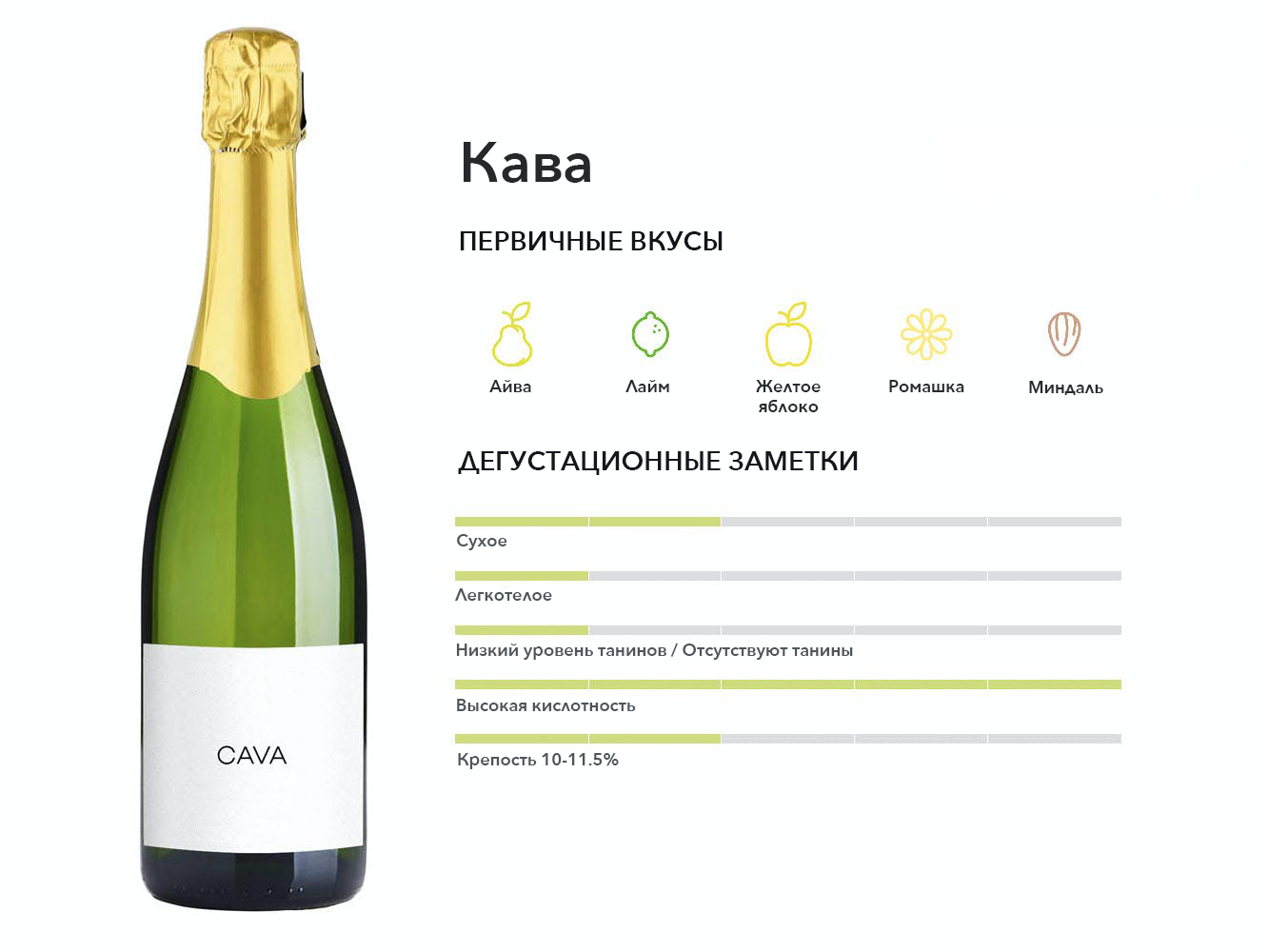 Кава — главное игристое вино Испании. В вине используется та же система уровней качества, что и в шампанском, но в нем используются несколько местных сортов винограда Испании, включая Макабеу (Виура), Шарелло и Парельяда.