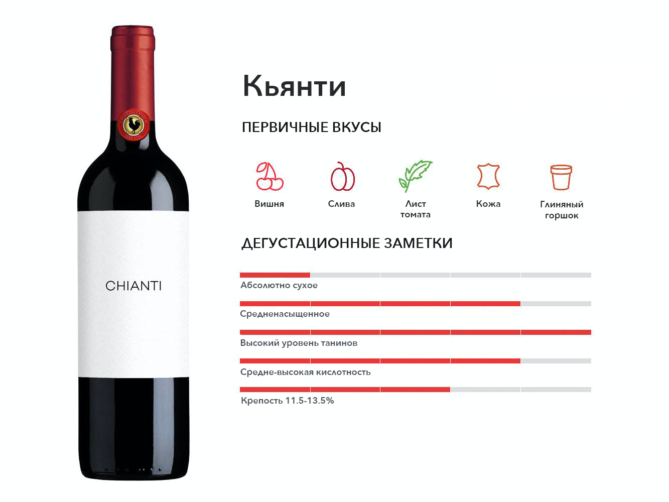 Всемирно известное тосканское вино на основе Санджовезе изначально продавалось в бутылках, обернутых соломой, под названием Fiascos. Вина Кьянти имеют множество классификаций по регионам и режимам выдержки.