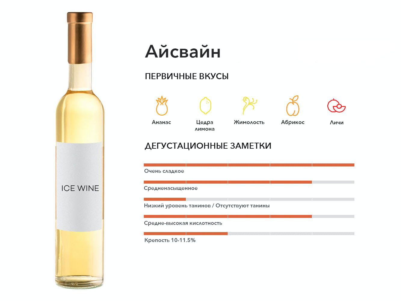 Сладкое вино позднего урожая, которое можно производить только тогда, когда виноград естественным образом замерзает на винограднике при температуре не ниже -8°C. Популярные сорта включают Рислинг, Видаль и Каберне Фран.
