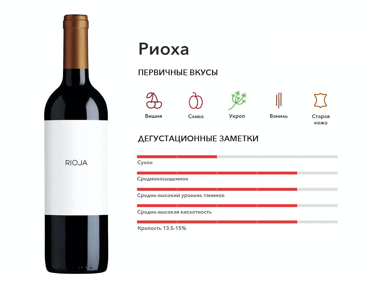 Самое известное региональное вино Испании из винограда Темпранильо. Вина известны своим пикантным, пыльным вкусом и способностью стареть. Риоха — одна из немногих винодельческих зон Европы, где используются бочки из американского дуба.