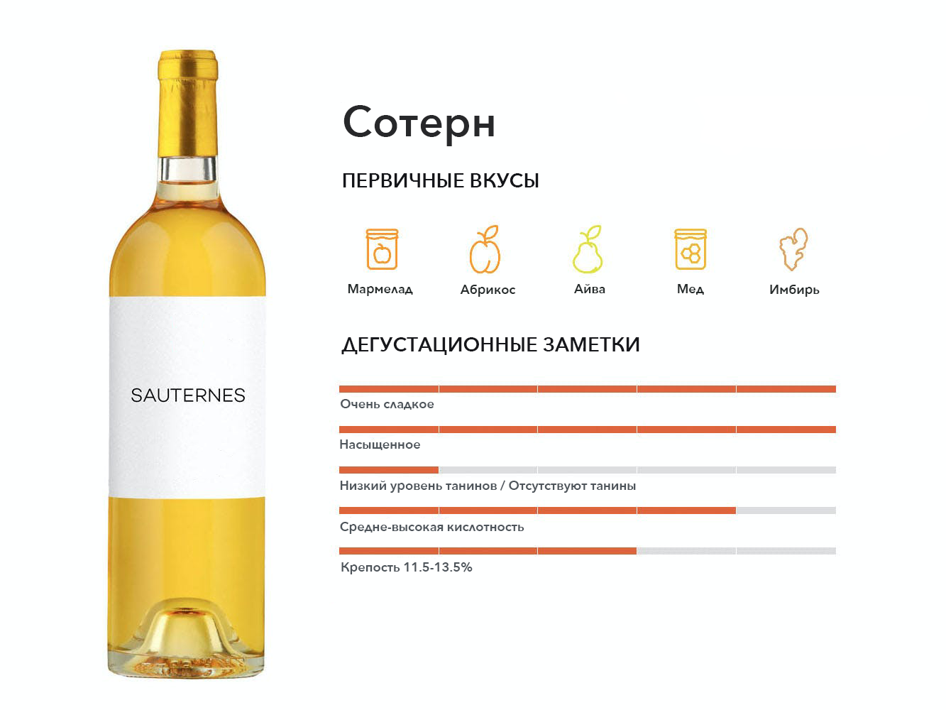 Группа редких десертных вин из Бордо, изготовленных из винограда сортов Семильон, Совиньон Блан и Мюскадель, зараженных особым видом гнили, называемой Botrytis cinerea, которая концентрирует виноградные сахара.
