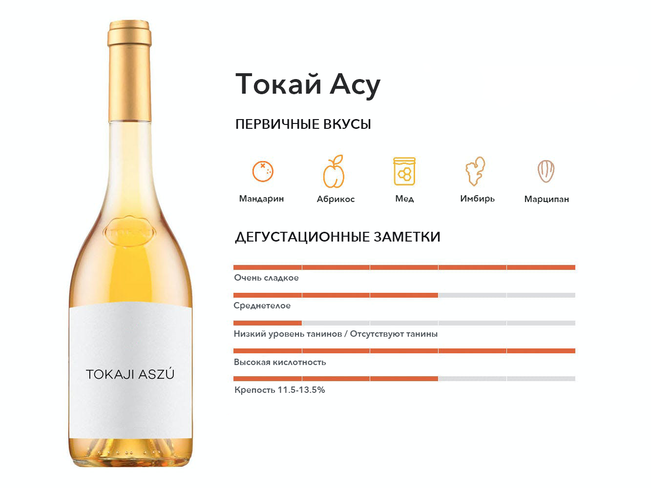 Известное венгерское сладкое вино, изготовленное в основном из винограда сорта Фурминт, пораженного особой гнилью, называемой Botrytis cinerea. Гниль концентрирует сахар винограда и добавляет отчетливые ароматы имбиря и шафрана.