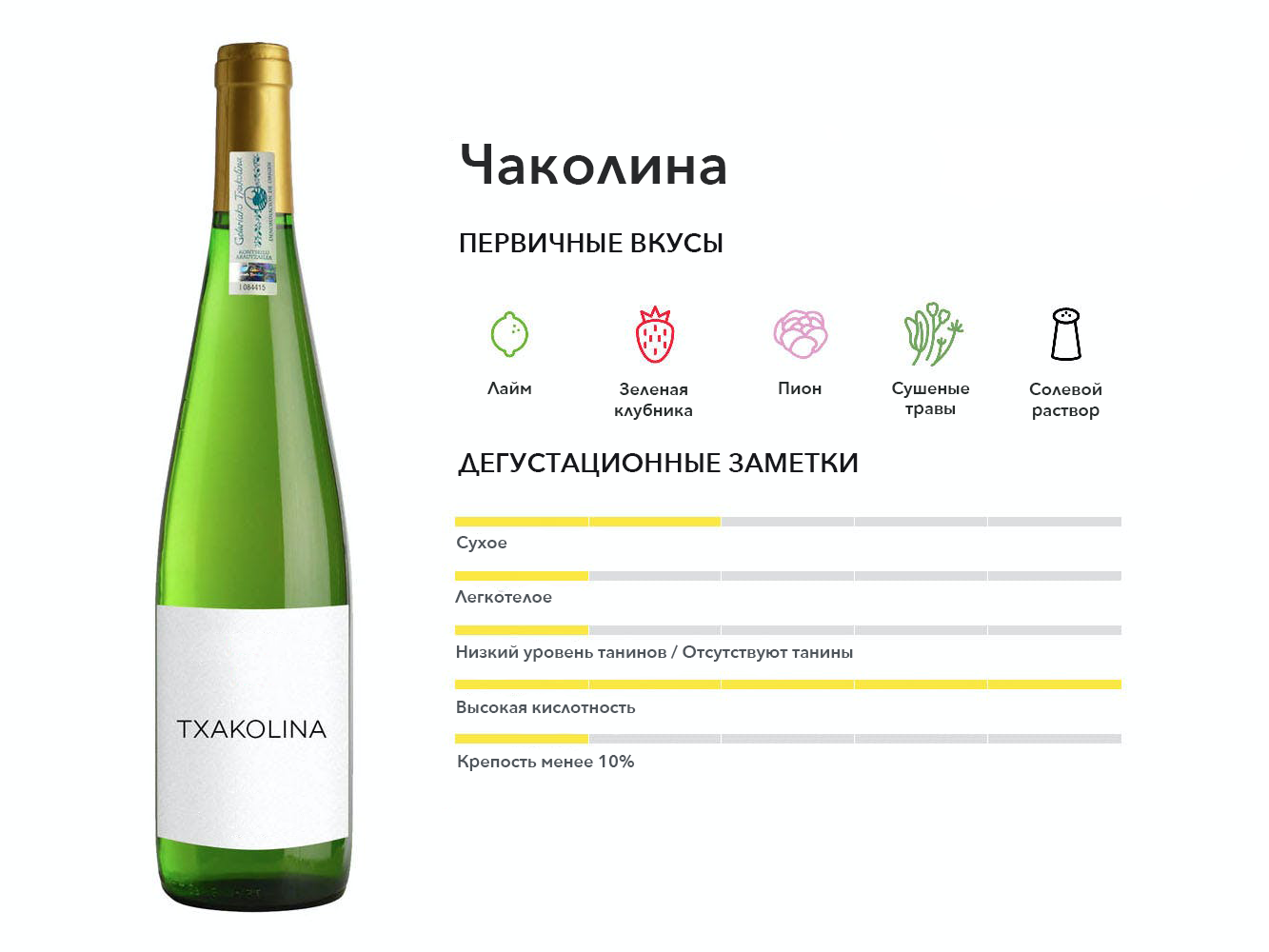 Сухое, слегка шипучее вино Txakolina из Страны Басков в Испании, произведенное в трех разных регионах из множества сортов винограда, в первую очередь Хондарраби Сури.