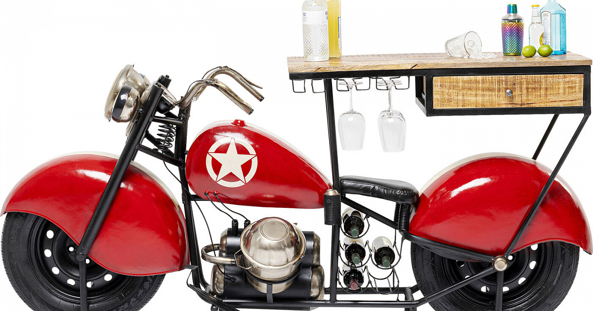Motorbike 86709 – это необычный шкаф-консоль, выполненный в форме ярко-красного байка. Он выполнит не только роль открытого бара, но и станет необычной декоративной деталью. Модель выполнена в прочном корпусе из качественной лакированной стали. В конструкции есть деревянная столешница и небольшой ящик из лакированного массива манго. Максимальная допустимая нагрузка для такой модели не превышает 30 килограмм. В конструкции также хитро припрятаны специальные полочки для бутылок. Такой шкаф будет привлекать к себе максимум внимания и удивлять функциональными возможностями. Подача напитков для гостей с такой мебелью станет яркой необычной и запоминающейся. Модель отлично впишется в любой интерьер.
