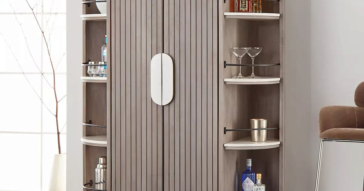 Две исчезающие дверцы-карманы с овальной мраморной фурнитурой ведут к мини-бару с мраморной столешницей, стеллажу на 14 бутылок, выдвижному ящику и стеллажу для фужеров на 12 бокалов.