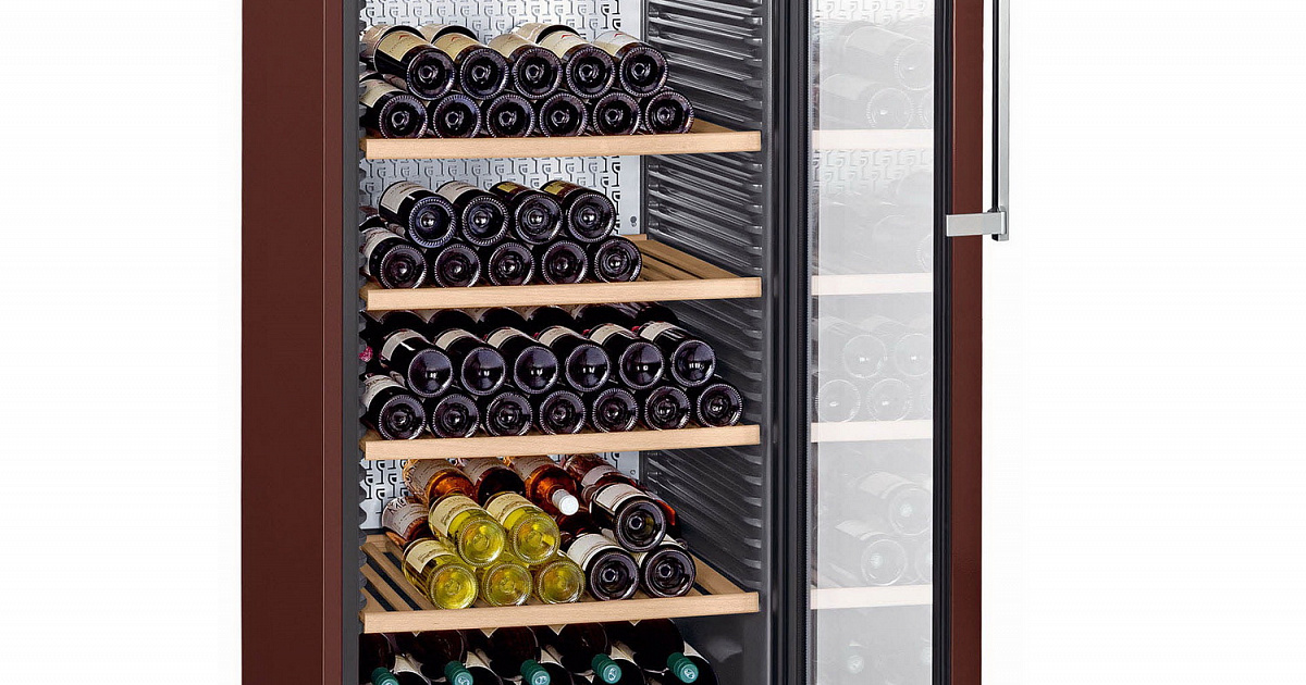 Очень вместительная модель отдельно стоящего винного шкафа WKt 4552 от немецкого производителя Liebherr отличается прекрасным функционалом и стильным дизайном. Корпус шкафа выполнен в необычно красивом коричневом цвете и удачно дополнен массивной алюминиевой ручкой со встроенной механикой открывания. Компрессорная система охлаждения гарантирует надежную работу устройства, минимальное энергопотребление и низкий уровень шума. Модель также оснащена фильтром с активированным углем и контрольным индикатором вентилятора. Винный шкаф позволяет хранить до 201 винной бутылки типа Бордо в единой зоне охлаждения. Диапазон температур, поддерживаемый внутри камеры, варьируется от +5°С до +20°С. Цифровая индикация температуры осуществляется благодаря технологии MagicEye. Все содержимое шкафа удобно располагается на 6 деревянных полках, а наличие внутренней подсветки еще больше облегчает доступ к вину.